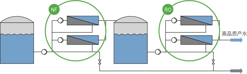 反滲透在脫鹽濃縮方面效果很好,最適宜稀溶液的濃縮,對濃度高的溶液處理受滲透壓和膜本身耐壓的限制,水回收率低,而納濾膜具有半脫鹽性能,可以讓單價離子部分通過而截流二價以上的離子,雖然納濾去除離子的能力不及反滲透,但是與反滲透相比,納濾具有操作壓力低,出水效率高、濃縮水排放少等優(yōu)點。如果把反滲透脫水和納濾結(jié)合起來,各自發(fā)揮優(yōu)勢,既減少了工程造價,回收率也比反滲透高,又減少了濃水的排放總量。